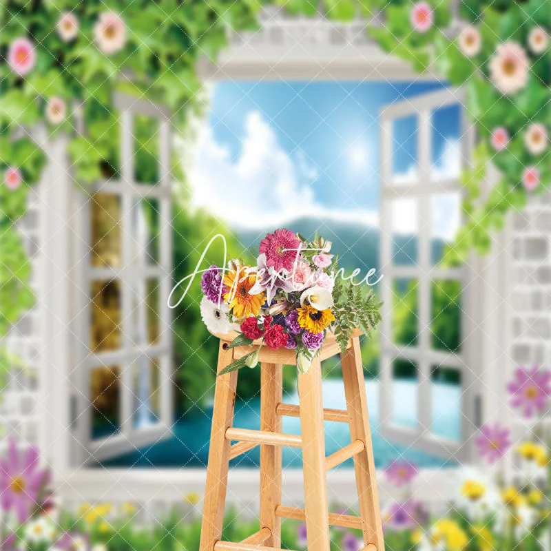 Spring White Window Floral Greeny Backdrop For Photo