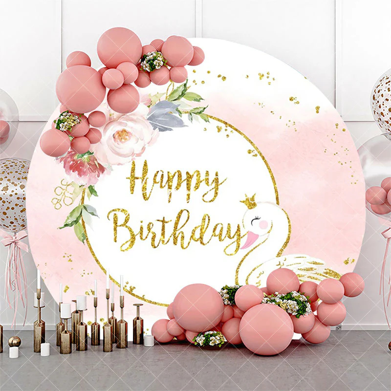 White Pink Gold Floral Swan Round Birthday Backdrop